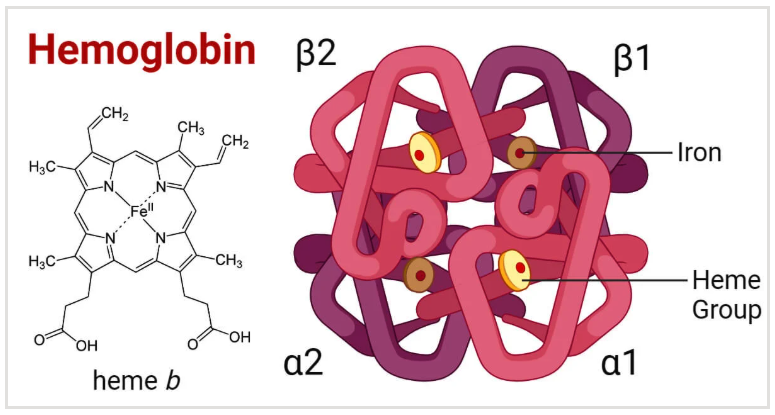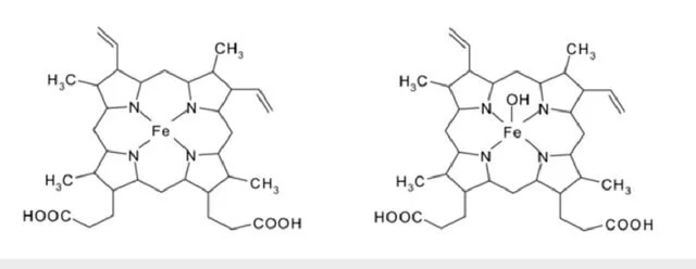 ⇠ Hemoglobin structure (L) versus Methemoglobin structure (R)