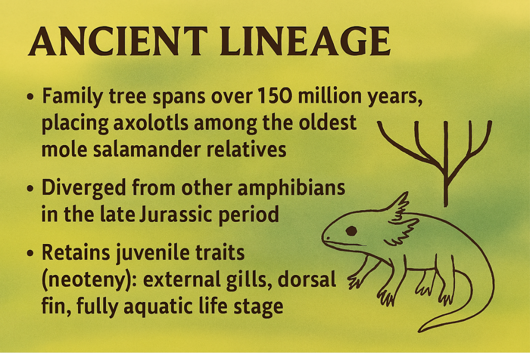 The axolotl’s family tree stretches back over 150 million years, placing it among the oldest surviving amphibian lineages. Belonging to the mole salamander family (Ambystomatidae), its ancestors diverged from other amphibians during the late Jurassic period — a time when dinosaurs still roamed the Earth. This deep evolutionary history has left the axolotl with traits that seem almost otherworldly.