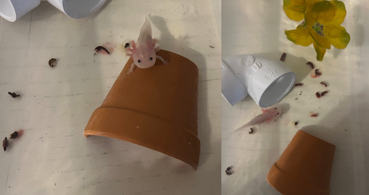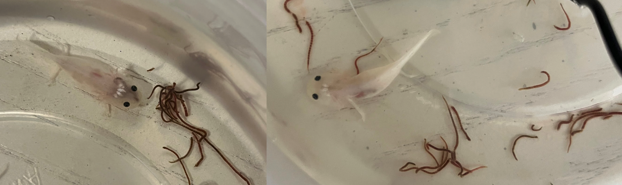 At first, she wouldn’t eat much besides a nibble. As her actual size was unknown prior to pickup, proper foods were being sent to her foster. She refused brine shrimp and daphnia before the blackworms arrived. It turns out blackworms are Olive’s absolute FAVORITE! For 3 months straight she had 24/7 access to blackworms. Blackworms are a wonderful staple food for axolotls that are gaining weight, growing, picky, or actively sick; they are loaded with nutrients!