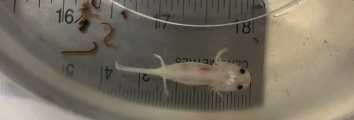 A few months after their intake, Olive was transferred to a new foster mom. She had assumed given her age that she would be at least 3 inches long. She was however surprised to find what appeared to be a baby about one inch in length! She was anemic and lacked all color besides her eyes. She had little to no filaments on her gills. She had a gimpy leg with some fused toes as well. It was looking like a failure to thrive case. She was monitored very closely.